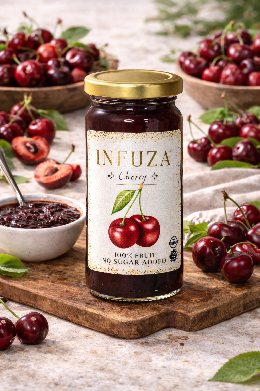 Experience the vibrant flavor of our Whole Cherry Premium Fruit Spread by INFUZA, made from the juiciest, sun-ripened cherries, with whole cherries included for an extra burst of flavor. Free from added sugar, artificial colors or flavors, and preservatives, this spread brings the pure essence of cherries to your table.