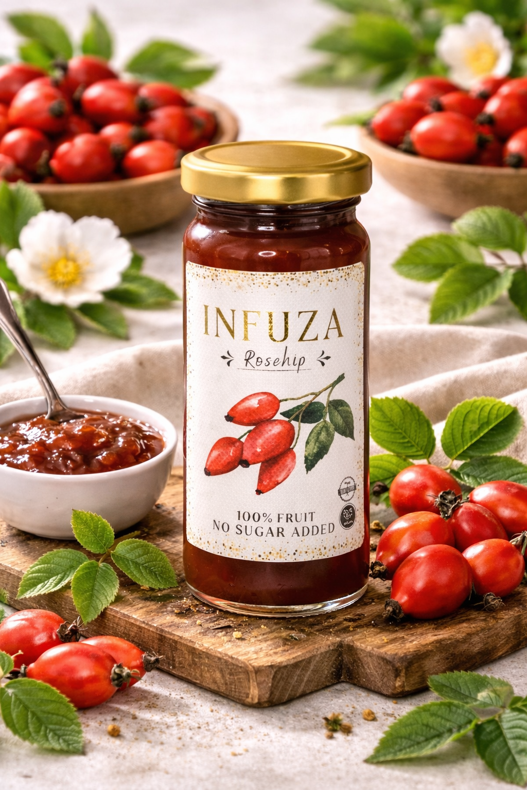 Experience the unique and refreshing taste of our Rosehip Premium Fruit Spread by INFUZA. Made from handpicked rosehips, this spread captures the distinctive tartness and natural goodness of this fruit. With no added sugar, artificial colors or flavors, and no preservatives, our rosehip spread is a nutritious and delicious choice.